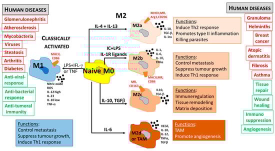 Summary of the main macrophage polarization states of activated macrophages in relation to functional roles and human diseases. M1-like or M2-like activation states can be induced by different stimuli and signaling pathways. In humans, distinct defensive or healing schemas are reported to be related to M1-like or M2-like polarization. Inducing factors are indicated on the arrows; antigens and receptors expression is represented in red; cytokines and chemokines production is shown in bold. LPS: lipopolysaccharide; MR: mannose receptor; TNF: tumor necrosis factor; TLR: Toll Like Receptor; Arg 1: arginase 1; IFNγ: interferon gamma; IL: interleukin; MCP: monocyte chemoattractant protein; TGF: transforming growth factor; MCSF: macrophage colony stimulating-factor; ROS: reactive oxygen species; MHC: major histocompatibility complex; VEGF: vascular endothelial growth factor. Modified from J. Novais Barbosa, D. Pereira Vasconcelos, Macrophage response to biomaterials, Handbook of Biomaterials Biocompatibility, 2020 [68].