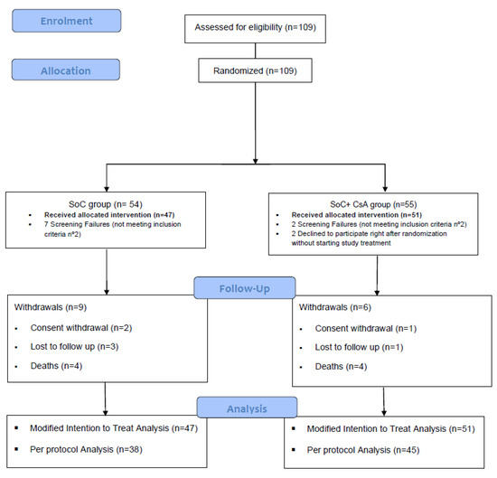 In the participants assigned to the CsA+SoC group, CsA was administered for 15.1 ± 7.5 days, at an average dose of 177 mg/day per patient, and drawing a mean cumulative dose of 2686.3 ± 1527 mg [95% CI 2256.8, 3115.8].