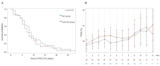 Comparison of the FiO2 requirements during hospitalization between groups. (A) Survival curves showing the probability of reaching FiO2 21% over time yielded no differences between the arms (log-rank test, p 0.48). (B) Daily FiO2 requirements in the ward-admitted patients (mean ± CI 95%).