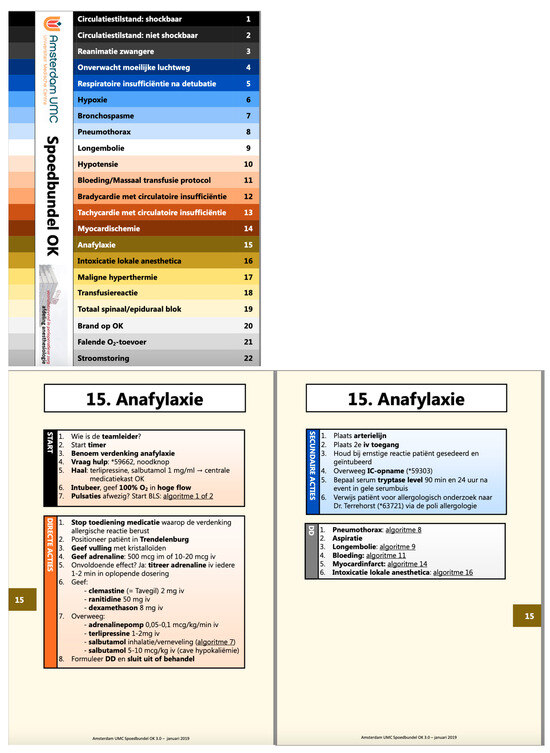 A branched, clustered cognitive aid bundle (CAB) design (CAB-1, University Hospital of Amsterdam) with a color-coded table of contents on the front cover (top) and corresponding side tabs to guide the user to the 22 algorithms (bottom). The individual algorithms (e.g., anaphylaxis) are all constructed with clear grouped text blocks, including ‘Start items’ at the top of the left page, followed by Direct actions’ and ‘Secondary actions’. A ‘Differential diagnosis’ or other information may appear on the right page in some algorithms.