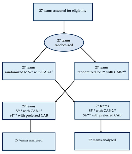 CONSORT flow diagram. Abbreviations: * S2 = scenario 2, ** S3 = scenario 3, *** S4 = scenario 4 and # CAB-1 = cognitive aid bundle 1, ## CAB-2 = cognitive aid bundle 2.