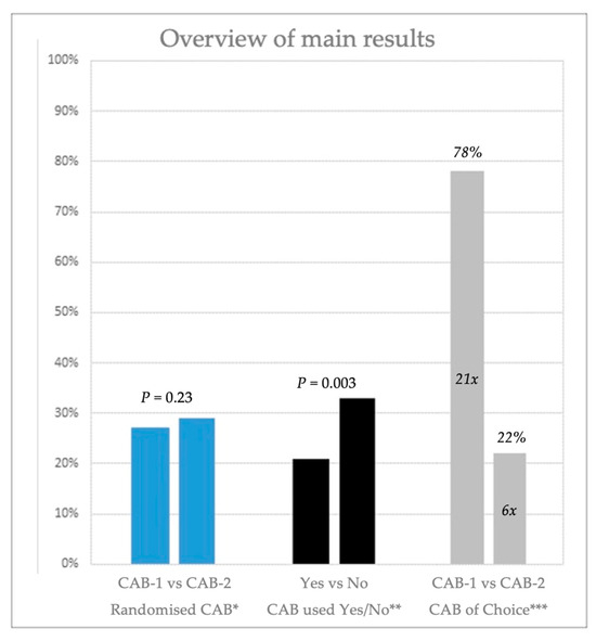 Statistical analysis was performed using IBM SPSS Statistics version 26.0 (IBM Corp., Armonk, NY, USA) for Windows. A p-value < 0.05 was considered statistically significant. The Kolmogorov–Smirnov test was used to check the distribution of data. Data are presented as mean ± standard deviation (SD) or median with interquartile range (IQR), depending on the distribution of the data. To compare the between-group differences in failure of adherence to best clinical practice, the Mann–Whitney U test was used. Descriptive statistics were used to evaluate the characteristics and the perceived usability of the CABs.