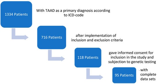 The primary diagnosis and treatment of the thoracic aortic pathology of 1334 patients were reviewed, and their primary data and patient records were screened. A total of 716 patients met the eligibility criteria. After contact, 118 patients consented to undergo genetic testing. Follow-up and human genetic data were missing for 23 patients; finally, 95 patients were enrolled in the study, as seen in Figure 1.