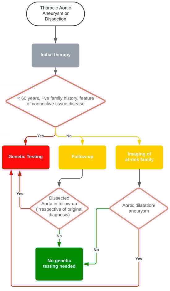 - Caruana, M.; Baars, M.J.; Bashiardes, E.; Benke, K.; Björck, E.; Codreanu, A.; De Moya Rubio, E.; Dumfarth, J.; Evangelista, A.; Groenink, M.; et al. HTAD patient pathway: Strategy for diagnostic work-up of patients and families with (suspected) heritable thoracic aortic diseases (HTAD). A statement from the HTAD working group of VASCERN. Eur. J. Med. Genet. 2023, 66, 104673. [Google Scholar] [CrossRef] [PubMed]