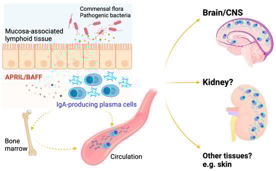 Mucosa-derived IgA antibody-secreting cells migrate to locations outside of the mucosal compartment. In the presence of B-cell activating cytokines APRIL and BAFF, mucosal-primed IgA-producing plasma cells may localize to non-mucosal tissues, including typically immune privileged sites such as the central nervous system. Figure created with BioRender.com.
