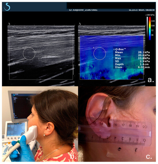 Patients were positioned supine and relaxed in habitual occlusion; any splints were removed. Gel was applied to the skin, and the patient was examined using the Aixplorer ultrasound system equipped with a shear wave device (Aixplorer, Aixen Provence, France), utilizing a 5–12 MHz linear-array probe (SL10-2, Aixplorer [SuperSonic Imagine]).