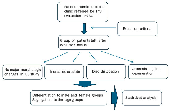 In the group of ultrasonographically “normal” joints, particularly in younger patients, psychosomatic conditions can be suspected as frequent important factors for increased muscle tension, especially in the orofacial region [35,36,37,38,39,40,41]. This may explain the numerous patients presenting with symptoms of head pain without a clear morphological cause.