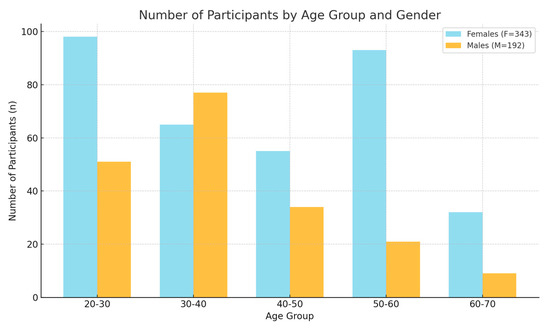 This graph (Figure 3) presents age and gender differences, showing distinct differences in the distribution of participants by age and gender. Notably, there was a peak in female participants in the 50–60 age group, whereas the male participants peaked in the 30–40 age group. Age-related trends: The number of participants declined with age for both genders, but the pattern of decline was different for males and females, indicating potential age-related factors affecting participation or the prevalence of the condition being studied.