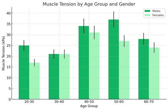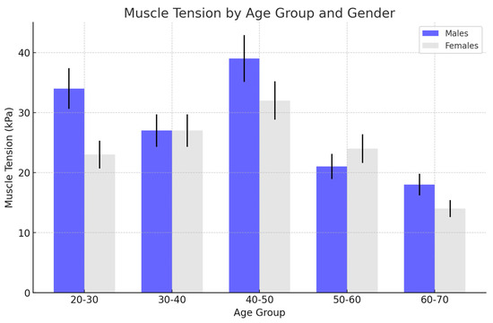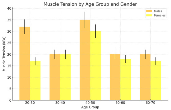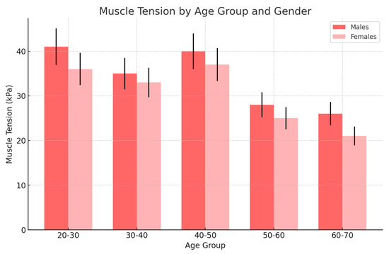 In the male group, muscle tension was consistently higher compared to the female group across all age groups. The tension increased significantly during the younger and middle ages, peaking in the 40–50 age group.