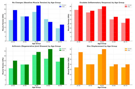 The most extreme muscle tension values indicating conditions of the highest clinical importance were found in this study. In the female group with excessive exudate, muscle tension peaked in the 40–50 age group at 37 kPa, which may correlate with increased inflammatory responses during middle age. With arthrosis, peak tension also occurred in the 40–50 age group at 31 kPa, indicating that joint degeneration has a significant impact on muscle tension during middle age. In the group where disc displacement was observed, tension remained relatively stable but peaked in the 40–50 age group at 30 kPa, showing moderate increases due to joint instability.