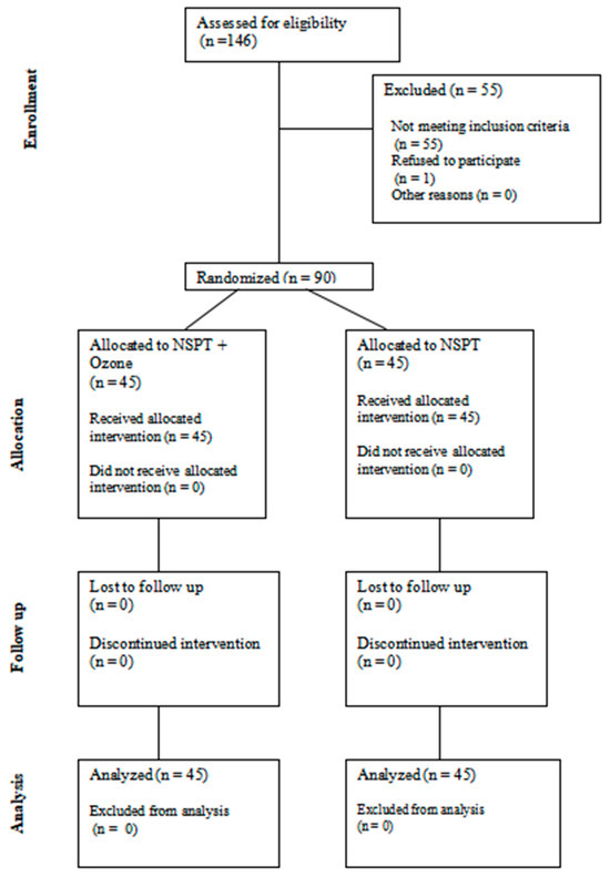 Our study included patients with periodontitis stages II–IV and grades A–C to evaluate ozone therapy efficacy across various disease severities and progression rates. This stratification allowed us to analyze treatment effects based on the initial disease presentation. The participant selection process followed the guidelines outlined in the CONSORT (Consolidated Standards of Reporting Trials) flow diagram. At the end of the screening process, a total of 91 participants were initially enrolled in the study. Of these, 1 participant withdrew consent during the initial enrollment phase, leading to a final total of 90 participants who completed the study.
