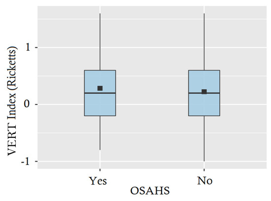 According to these results, Student’s t-test (significance 0.05) was performed on both groups, which concluded that there were no significant differences between patients with and without a diagnosis of OSAHS in the values of Ricketts’ VERT index (p-value = 0.748, CI (95%) = [0.317, 0.417]), so it cannot be concluded that the VERT index is in itself a predictive parameter of the existence of OSAHS (Figure 2).