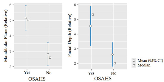 Graphic of 95% confidence interval of relative mandibular plane (p-value < 0.001) and relative facial depth (p-value = 0.011) differentiated by OSAHS.