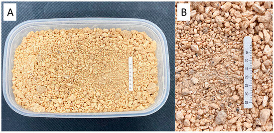 Volcanic ash sourced from Kiso Ontake, Kiso district, Japan. (A) displays the image of the volcanic ash in the package upon arrival, while (B) is an enlarged photo of the same. The bar represents Schirmer tear test strips, measured in millimeters.