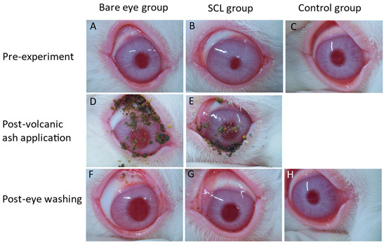 Slit-lamp photographs in bare eye group (A,D,F), SCL group (B,E,G), and control group (C,H). SCLs were present on eye in (B,E). Pre-experiment: (A–C). Post-volcanic ash application: (D,E). Post-eye washing: (F–H). In SCL group, SCLs were removed after eye washing (G).