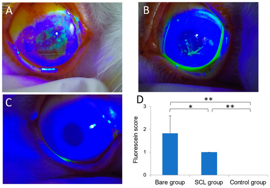 Slit-lamp photographs of fluorescein staining in the bare eye group (A), SCL group (B), and control group (C), along with a histogram of fluorescein scores in Image (D). The control group exhibits no staining, resulting in a fluorescein score of zero. Both the bare eye and SCL groups show corneal staining, with the SCL group demonstrating significantly lower staining scores compared to the bare eye group. The mean ± standard deviation of the fluorescein staining scores for each animal group (n = 6) is presented, with significant differences marked by * p < 0.05 and ** p < 0.01, respectively.