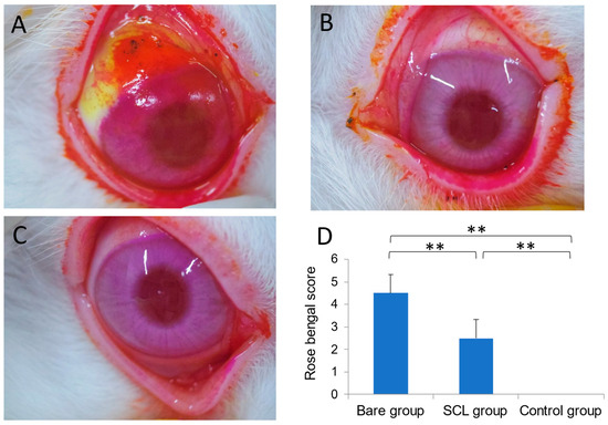 Slit-lamp photographs of rose bengal staining in the bare eye group (A), SCL group (B), and control group (C), along with a histogram of rose bengal scores in Image (D). The control group exhibits no staining, resulting in a rose bengal score of zero. Both the bare eye and SCL groups show corneal and conjunctival staining, with the SCL group demonstrating significantly lower staining scores compared to the bare eye group. The mean ± standard deviation of the rose bengal staining scores for each animal group (n = 6) is presented, with significant differences marked by ** p < 0.01.