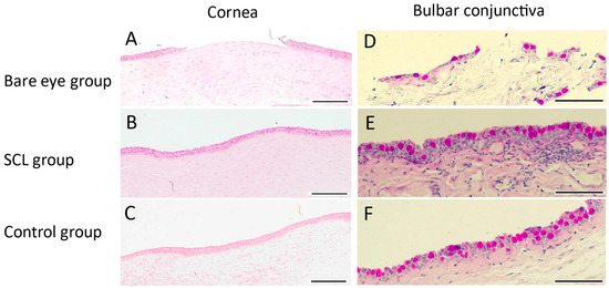 Findings from PAS staining indicated that the bare eye group exhibited abnormalities in the conjunctival epithelium and a reduction in PAS-positive cells, which were likely goblet cells of the conjunctiva (Figure 5D). In the SCL group, damage to the conjunctival epithelium was not prominent, and most of PAS-positive cells were preserved (Figure 5E). The control group remained intact (Figure 5F).