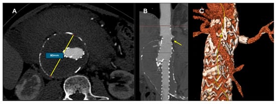 PG-EVAR for ruptured AAA after previous EVAR. Eleven patients were managed with PG-EVAR. Among them, a patient with an 80 mm juxta-renal aneurysm after previous EVAR was treated with a single parallel graft targeting the preservation of the left renal artery (A,B). The short infrarenal neck did not permit the application of standard EVAR ((B); yellow arrow). The 36-month CTA confirmed the favorable technical outcome with no endoleak and a patent target vessel (C).