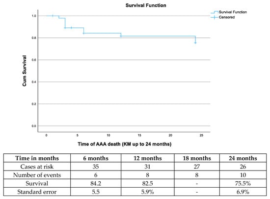 The mean time of follow-up was 13 ± 9 months, 14 ± 9 months in the standard EVAR group, and 17 ± 15 months in the PG group. After excluding the patients that died within the initial 30 days, the estimated survival was 81.5% (standard error (SE): 5.9%) at 12 months and 75.5% (SE: 6.9%) at 24 months with nine additional deaths in the standard EVAR group and one in the PG group (Figure 2). Among them, two events were aneurysm-related (4.3%, 2/46; both in the standard EVAR group); one occurred 50 days after the procedure in a patient with extended hospitalization and in-hospital infection and a second one due to aneurysm rupture related to a type Ia endoleak. For the remaining deaths, four were related to cancer, two to stroke, and two to cardiac causes (one related to arrythmia and one to myocardial infarction).