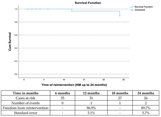 Regarding endoleaks, only one event of type Ia endoleak was recorded. No type Ib or III endoleaks were detected during follow-up. The estimated freedom from reintervention was 96.9% (standard error (SE): 3.1 SE%) at 12 months and 89.7% (SE: 5.7%) at 24 months (Figure 3). In total, three reinterventions were reported, all in the standard EVAR group. One coiling related to a type II endoleak and a sac increase of 5 mm within 6 months and one iliac limb occlusion managed with mechanical thrombectomy and relining. The last reintervention was related to pseudoaneurysm formation in a left femoral access site managed with open reconstruction. No parallel graft occlusion or stenosis was detected during follow-up and no reintervention was performed.