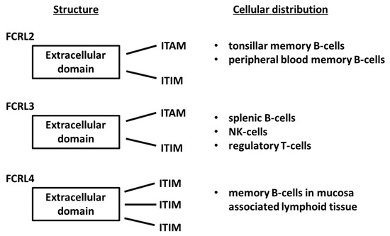 4]. FCRL genes are located on chromosome 1, in close proximity to the Fc receptor gene. In humans, this gene family encodes six transmembrane receptors, i.e., FCRL1–6, and two intracellular proteins, i.e., FCRLA and FCRLB [
