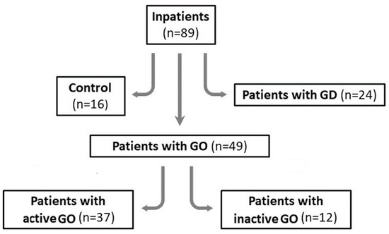 The patients were divided into the following three main groups: Controls—sixteen (16) out of 89 subjects (16/89; 18%) who were healthy individuals and were confirmed to be individuals without a history of GD, GO or any other autoimmune disease; Patients with GD—twenty four (24) out of 89 subjects (24/89; 27%) with a positive test for a TSH receptor autoantibody (TSHRAb) and laboratory features of thyrotoxicosis; Patients with GO—forty nine (49) out of 89 subjects (49/89; 55%) in whom diagnosis of GO was based on standard criteria, including positive tests for TSHRAbs currently or in medical history and positive ophthalmic assessment. The third group of 49 patients was further divided into the two following groups: thirty-seven (37) out of 89 subjects (37/89; 42%) diagnosed with active GO and twelve (12) out of 89 subjects (12/89; 13%) with inactive GO. GO was classified as clinically active or inactive, as recommended by the European Group on Graves’ Orbitopathy (EUGOGO) [