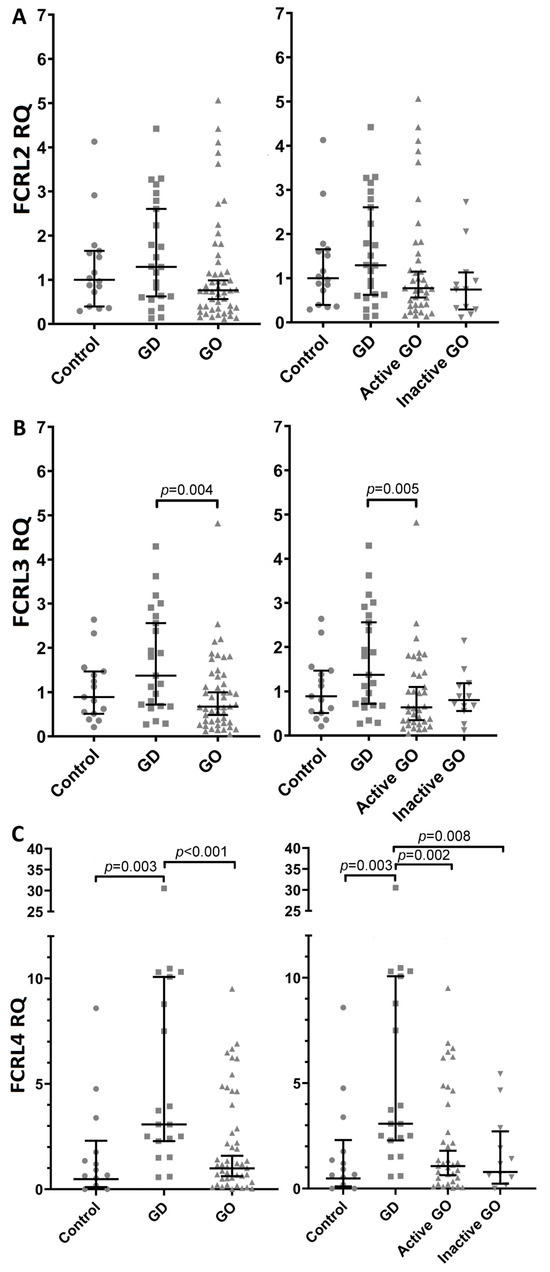 Regarding FCRL3 mRNA expression, no statistically significant differences were found between active GO and inactive GO (0.639 vs. 0.803, p = 0.362) as well as between Controls and active GO (0.889 vs. 0.639, p = 0.968) or inactive GO patients (0.889 vs. 0.803, p = 0.456).