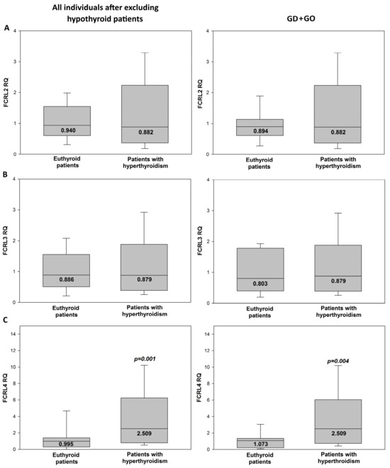 Figure 4A,B, left and right). Instead, FCRL4 mRNA expression was higher in patients with hyperthyroidism (subclinical + overt) than in euthyroid patients (2.509 vs. 0.995,