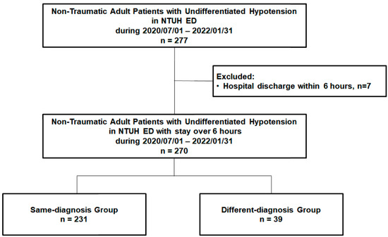 The primary objective of this study was to explore whether the initial misclassification of undifferentiated hypotension in the ED has a significant impact on the clinical outcomes of patients. This prospective observational study was conducted in the ED of National Taiwan University Hospital (NTUH), a 2500-bed medical center that provides both primary and tertiary care in Taipei [18]. NTUH provides 24 h emergency care, and its ED has an average number of 300 visits per day. Critical patients are initially treated and constantly monitored in the critical area of the ED by experienced senior residents and attending physicians. The primary care physicians in the critical area of the ED may reserve the decisions to follow the standard operating protocols of the ED and might adjust the examinations and management according to the specific needs of each patient. This study was approved by the Institutional Review Board (IRB) of NTUH (IRB number: 202005121RINB; ClinicalTrials.gov Identifier: NCT04478045), and the written informed consents from all subjects and/or their legally authorized representative were obtained.