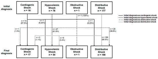 Further examination and continuous patient management facilitate the accurate classification of shock type by the time of discharge. Studies have demonstrated the serious consequences of initial misdiagnosis; nonetheless, diagnostic errors are not uncommon in the ED [14,15,16,17]. However, the prevalence of the misclassification of shock and its effects on patients’ clinical outcomes remain unclear. Therefore, the current study aimed to investigate whether the initial misclassification of undifferentiated hypotension in the ED affects patients’ clinical outcomes.