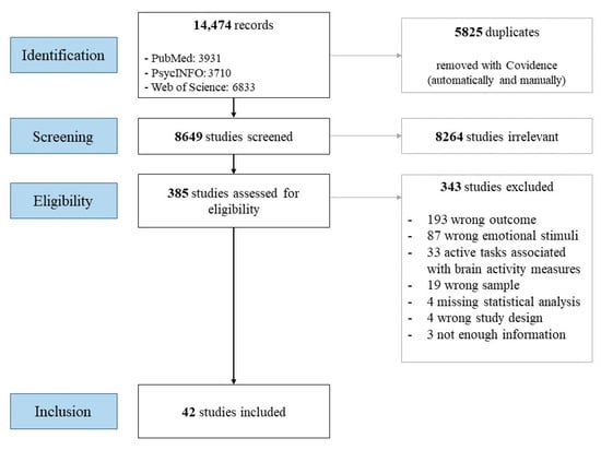 - Concerning the task: (4) Emotional processing studies (i.e., brain activation), in which the participants must complete a task while viewing the emotional stimulus other than rating their emotional experience (e.g., gender discrimination, age discrimination). We chose to exclude these studies, as neural responses are modulated by task instructions [25]. (5) Studies using passive oddball paradigms, as neurological measures can be modulated by the novelty of the deviant stimulus rather than its significance [26]. (6) Studies about imitation, in which researchers explicitly asked the participants to imitate or copy the emotional expression.