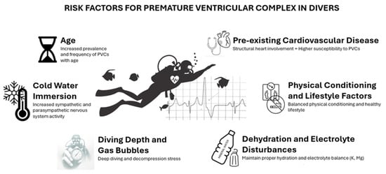 The occurrence of PVCs in divers is likely to be influenced by a complex interplay of individual health factors, the physical demands of diving, and the unique environmental conditions associated with the underwater environment. While the current literature does not provide definitive evidence for specific causative factors, several potential contributors have been identified, as detailed in the following (see also Figure 1).