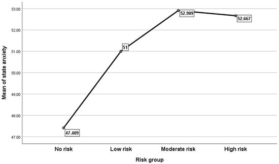 An analysis of variance was carried out to determine whether there were any statistically significant differences between the risk groups. The results indicated that state anxiety differed statistically significantly between the preoperative risk factor groups, F(3, 69) = 5.166, p = 0.003. The group differences that were statistically significant were those of the no-risk group with the low (p = 0.026) and moderate risk (p = 0.007) groups. Figure 1 presents the mean plots for the analysis.