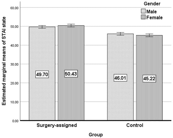 Figure 2 presents the estimated marginal means of STAI state anxiety among the two research groups divided by gender, with error bars denoting 95% confidence intervals. There is a higher relative increase in state anxiety in the females in the cataract-assigned group compared to males, while the trend is reversed in the control group.