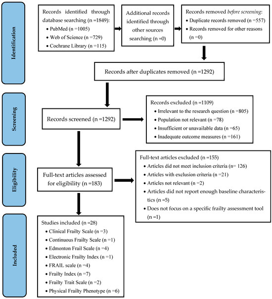 - Buta, B.J.; Walston, J.D.; Godino, J.G.; Park, M.; Kalyani, R.R.; Xue, Q.-L.; Bandeen-Roche, K.; Varadhan, R. Frailty assessment instruments: Systematic characterization of the uses and contexts of highly-cited instruments. Ageing Res. Rev. 2016, 26, 53–61. [Google Scholar] [CrossRef]