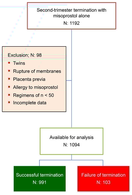 A retrospective study as a secondary analysis based on the prospective database of pregnancy termination in the second trimester was conducted at Maharaj Nakorn Chiang Mai Hospital, a tertiary center and university hospital at Chiang Mai University, Thailand, between June 1997 and December 2023. The study was ethically approved by the Institutional Review Boards (Research Ethics Committee 4, Faculty of Medicine, Chiang Mai University; study code ID: OBG-2566-09390, approval date 11 May 2023).