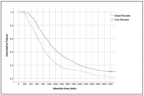 In addition to the observation that fetal death had a strong effect on decreasing the risk of failure, with an odds ratio of about 0.1, the Kaplan–Meier curve of abortion time in the cases with dead fetuses was significantly shorter than those with live fetuses (log-rank test, p < 0.001), as presented in Figure 2.