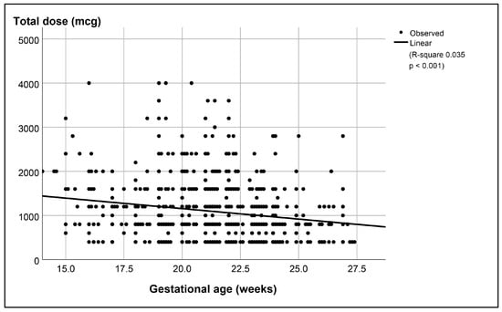 In the overall regression analysis, gestational age was also significantly associated with abortion time (p < 0.001), as presented in Figure 3, and was significantly associated with the total doses of misoprostol required for successful termination (p < 0.001), as presented in Figure 4. In a subgroup analysis that compared the failure rate between the subgroup with a gestational age of 22 weeks or more and the subgroup with a gestational age of less than 22 weeks, the subgroup with a gestational age of less than 22 weeks had a significantly higher failure rate (p-value 0.001, with a relative risk of 1.90), as presented in Table 3.