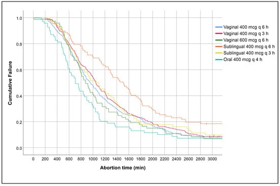 Among the various regimens, the median time for success based on Kaplan–Meier curves and the mean duration of abortion time among the successful cases were significantly higher in the group receiving sublingual 400 mcg every 6 h and significantly lower in the group receiving oral 400 mcg every 4 h, whereas the other regimens were comparable, as presented in Table 4 and Figure 5.