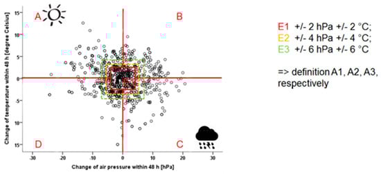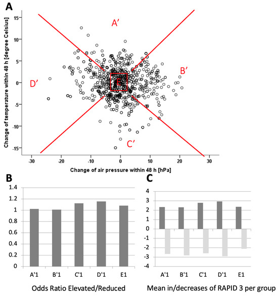 To analyze whether the temperature or the air pressure predominantly defined the weather change, the groups were redefined as A’ to D’ with the same inner quadrate E1- E3 by rotating the axes by 45° to the right (Figure 3A). Again, the demographic data for all groups were defined and revealed no differences for either group. When the absolute changes (Figure 3C) and frequencies (Figure 3B) of RAPID changes were analyzed, no differences were found for the respected subgroups.