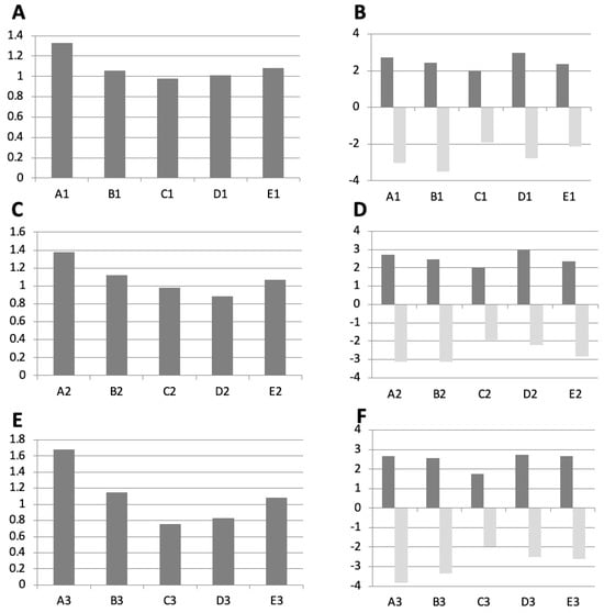 Change of RAPID-3 scores between two measurements were analyzed for all patients and visits. RAPID−3 were correlated with changes in weather, defined by changes in air pressure and temperature per group (A–E), as defined in Figure 1. Odds Ratios (panels (A,C,E)): the ratio of the number of episodes where the RAPID-3 scores increased as compared to those where they decreased is demonstrated for each quadrant and square size. This shows how likely RAPID-3 score increased or decreased with changes in weather conditions. Mean increases and decreases of RAPID-3 (panels (B,D,F)): This shows the average amount by which the RAPID-3 scores either increased or decreased in each quadrant and for each square size. It provides a more detailed view of the magnitude of change in disease activity in relation to the weather.