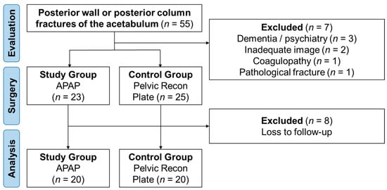 From January 2015 to December 2018, acetabular fractures treated by the senior author at a single level-I trauma center were retrospectively reviewed. Patients with posterior wall or posterior column fractures of the acetabulum requiring open reduction and internal fixation (ORIF) were included. Surgical indications encompassed hip instability, hip joint incongruity with an articular step-off exceeding 2 mm, inadequate secondary congruence, the presence of intra-articular fragments, and posterior column displacement exceeding 2 mm. Patients underwent treatment with either the APAP or a pelvic reconstruction plate. All implants used were FDA approved. Exclusion criteria comprised pathological acetabular fractures, neuropathic arthropathy, coagulopathy, dementia, and other conditions affecting postoperative compliance. (see Figure 1)