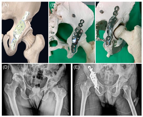 Design and application of the anatomical posterior acetabular plate (APAP). (A) A 3D reconstruction of the right hip joint demonstrates the APAP’s design and optimal positioning for plating the posterior wall of the acetabulum. (B,C) Application of the APAP on a sawbone model in posteroanterior and iliac oblique views, respectively. (D) Radiograph displaying a case with a posterior wall fracture and concurrent posterior hip dislocation. (E) Postoperative radiograph illustrates the case after open reduction and internal fixation with the APAP, achieving anatomical reduction and concentric alignment of the hip joint.