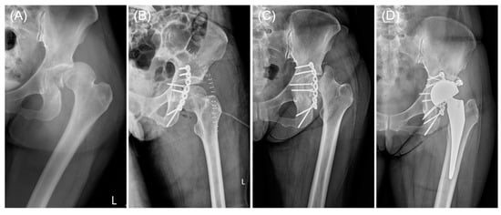 - Cichos, K.H.; Spitler, C.A.; Quade, J.H.; McGwin, G., Jr.; Ghanem, E.S. Fracture and Patient Characteristics Associated With Early Conversion Total Hip Arthroplasty After Ace-tabular Fracture Fixation. J. Orthop. Trauma 2021, 35, 599–605. [Google Scholar] [CrossRef]