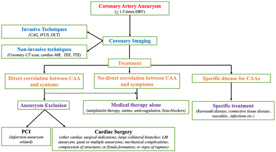 We propose an algorithm for coronary artery aneurysm (CAA) management to underline the importance of coronary imaging in completing diagnostic assessment and choosing the correct treatment approach (Figure 1).