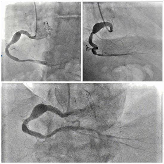 Coronary angiography in three different projections of the right coronary artery (in order: LAO 30, RAO 30, LAO 30 CRAN 30) showing an aneurysmal formation in the mid–proximal segment.