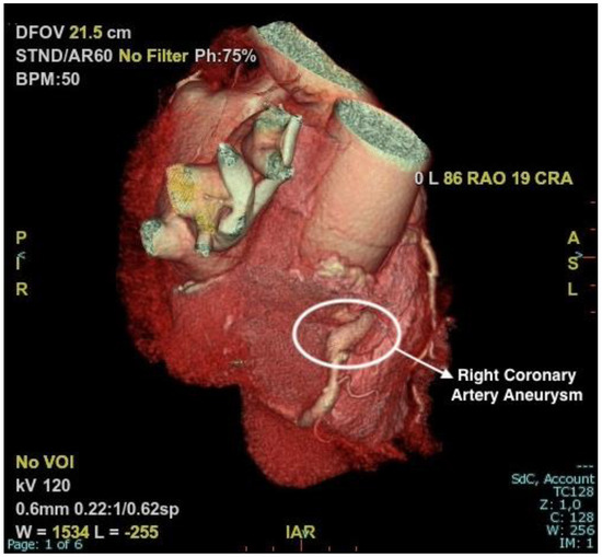 - Cohen, P.; O’Gara, P.T. Coronary artery aneurysms: A review of the natural history, pathophysiology, and management. Cardiol. Rev. 2008, 16, e301–e304. [Google Scholar] [CrossRef]