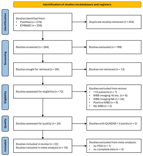 The PubMed/MEDLINE and EMBASE searches identified 279 and 259 studies, respectively, resulting in a total of 538 studies. After removing 254 duplicates, 284 articles were assessed for eligibility by title and abstract screening. At this stage, 199 studies were excluded. The remaining 85 studies underwent full-text assessment. The full text of 13 studies was not available, leaving 72 studies. Based on the pre-specified inclusion criteria, 48 studies were not eligible for inclusion. Quality assessment was performed in 24 studies, of which two were excluded for high risk of bias (QUADAS < 4 points). As a result, 22 studies were included in the systematic review. In the meta-analysis phase, studies focusing on [18F]FDG PET/CT (n = 20) were assessed for inclusion. Complete data necessary to construct a confusion matrix were not available in 3 studies, which were excluded. Finally, 18 studies were included in the meta-analysis. A visual representation of the article selection process is shown in Figure 1.