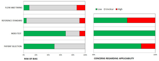 - Whiting, P.; Rutjes, A.; Westwood, M.; Mallett, S.; Deeks, J.J.; Reitsma, J.B.; Leeflang, M.M.; Sterne, J.A.; Bossuyt, P.M.; QUADAS-2 Group. QUADAS-2: A revised tool for the quality assessment of diagnostic accuracy studies. Ann. Intern. Med. 2011, 155, 529–536. [Google Scholar] [CrossRef]
